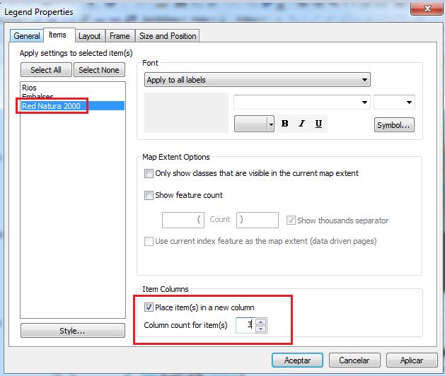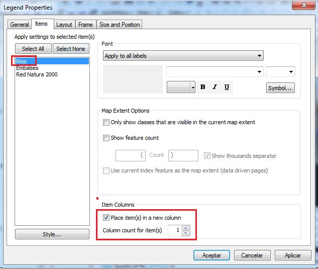 Pulsamos sobre la leyenda con el botón derecho < Propiedades. En la pestaña Items seleccionamos el primer elemento “Rios”, activamos la opción Place ítem(s) in a new column y especificamos 1 columna para este elemento.