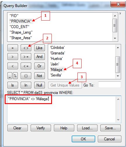 Mediante esta opción podemos seleccionar cualquier campo de la tabla y hacer las querys que necesitemos. Nosotros vamos a indicar que queremos mostrar todas las provincias menos la de Málaga. Para ello hacemos doble clic sobre “Provincia” (1), seleccionamos el símbolo de diferente (<>) (2), pulsamos en Get Unique Values (3) y seleccionamos “Malaga” (4). Así le estamos indicando que queremos mostrar todas las provincias diferentes a Málaga:
