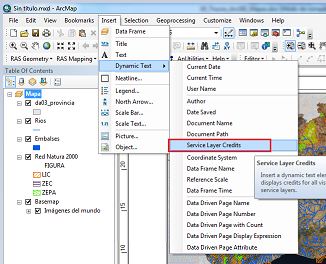 Existe un truco de ArcGIS que nos permite eliminar estos créditos. Lo podemos hacer con la opción Insert < Dynamic Text < Service Layer Credits. Así los créditos se transformarán en texto y podremos sacarlo fuera de la vista de presentación del mapa.