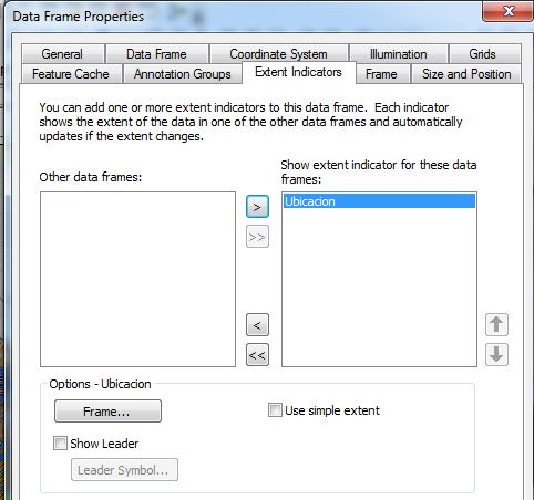 Esto lo hacemos pulsando sobre el Data frame del mapa general con el botón derecho < Properties < Extent Indicators. Seleccionamos el data frame de ubicación y lo pasamos a la parte de la derecha.