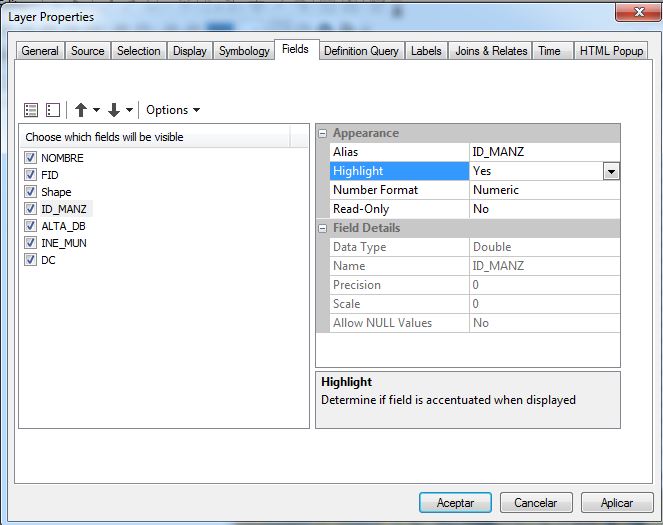 El cuarto de los trucos de ArcGIS nos va a permitir resaltar un campo de la tabla de atributos para poder visualizarlo rápidamente.