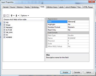 Para modificar el nombre de un campo pulsamos sobre la capa (botón derecho) < Fields < seleccionamos el campo al que le queremos cambiar el nombre y en la opción de “Alias” escribimos el nuevo nombre que queremos darle.