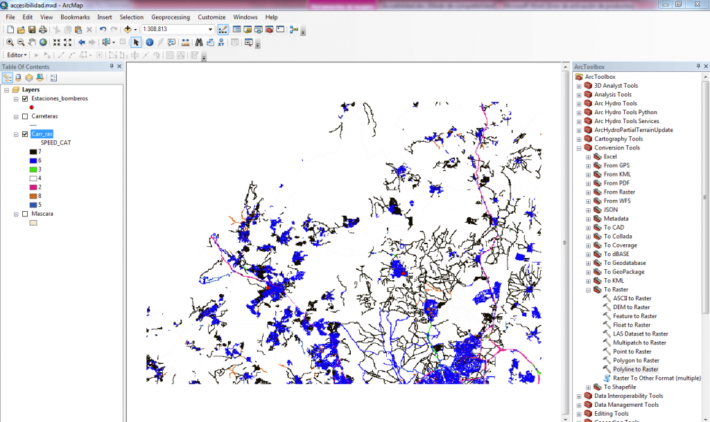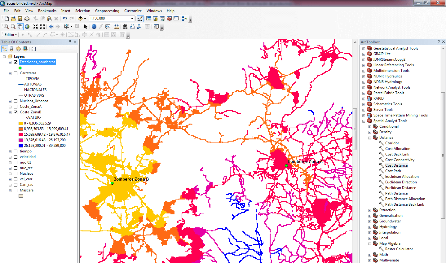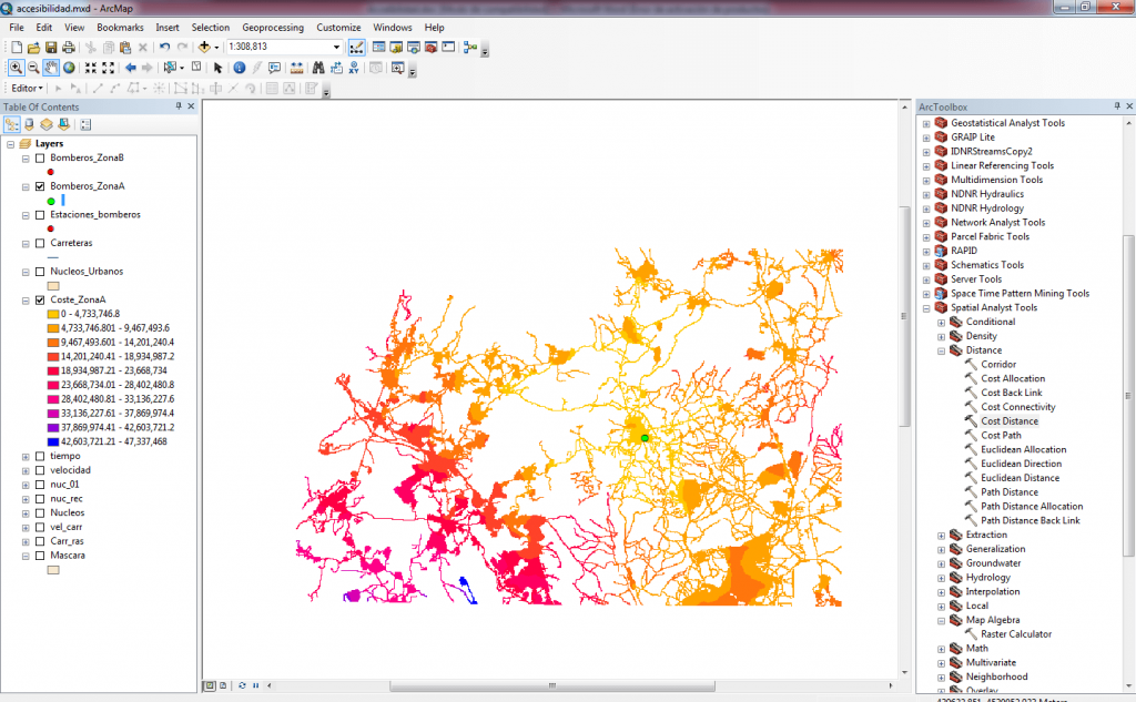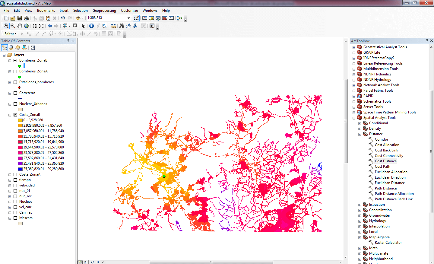 Finalmente para obtener el raster que nos indique el tiempo al que está cada estación de bomberos debemos separar cada estación en una única capa y realizar para cada una de ellas el análisis de “Cost Distance” ArcToolbox < Spatial Analyst Tools < Distance < Cost Distance: