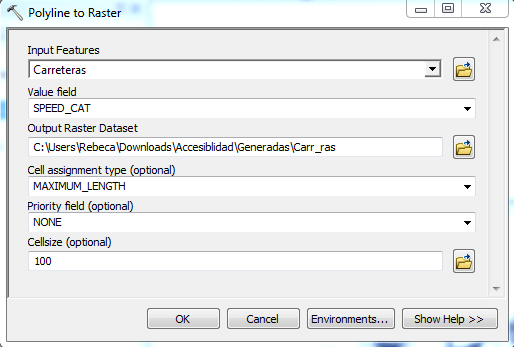 Como capa de entrada seleccionamos la que contiene las carreteras. De ésta capa el campo que nos interesa convertir a raster es el campo denominado «SPEED_CAT». Asignamos la ruta de guardado y el tamaño de celda (nosotros trabajaremos con un tamaño de 100 metros).