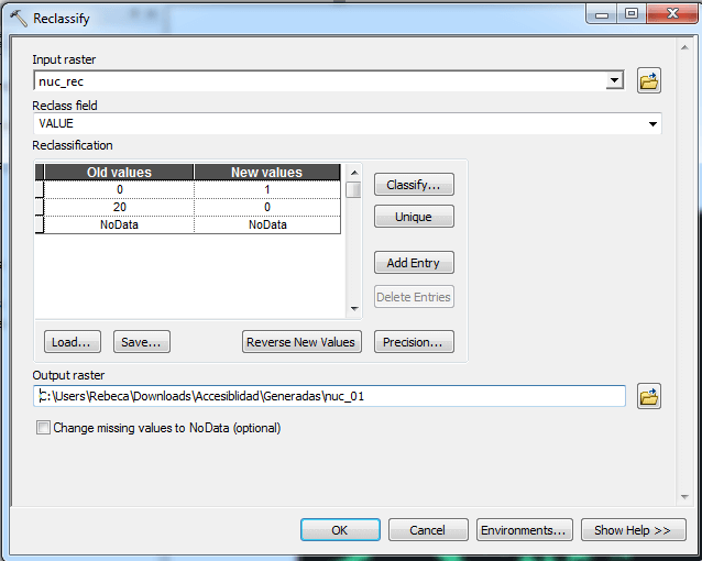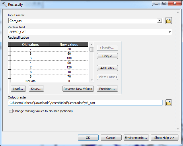 Seleccionamos el raster y el campo correspondiente y asignamos los valores de velocidad a cada una de las categorías. Además, a las celdas sin dato habrá que darles el valor de «0»: