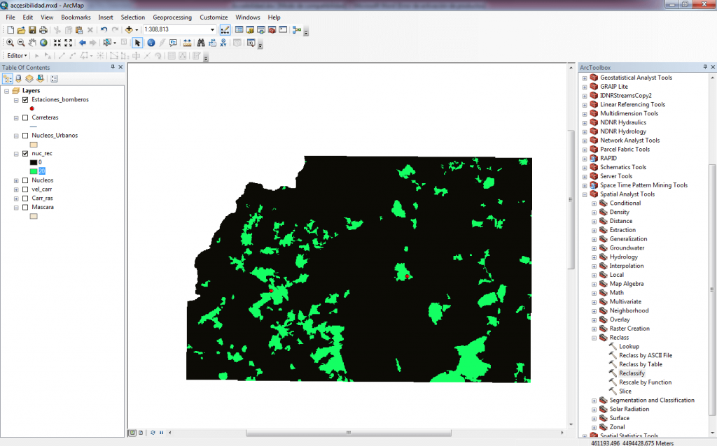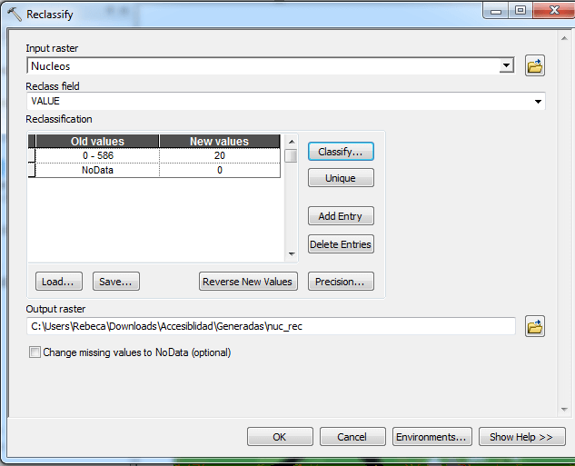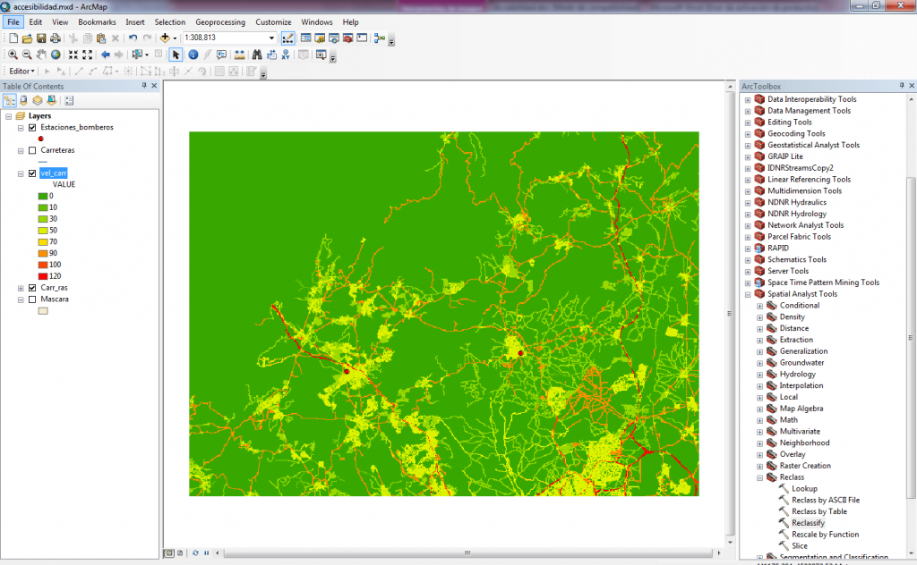 Ahora vamos a reclasificar el raster para asignar los valores de velocidad según la tabla ArcToolbox < Spatial Analyst Tools < Reclass < Reclassify.