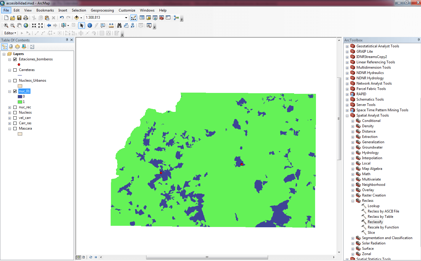 Para considerar esto, tenemos que generar un nuevo raster a partir del de velocidad en núcleos con valor 0 donde existen núcleos y 1 donde no.