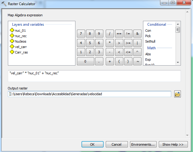 Para hacer esta operación abrimos la calculadora raster y escribimos la expresión seleccionando las capas ArcToolbox < Spatial Analyst Tools < Map Algebra < Raster Calculator: