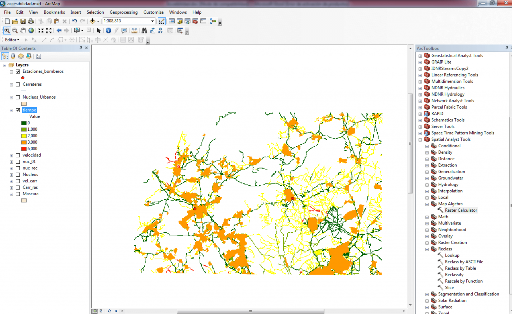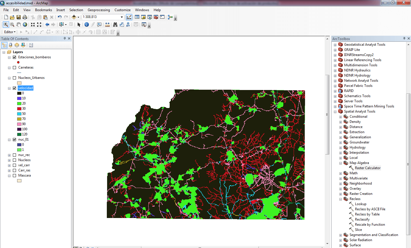 Esto dará como resultado un raster de velocidades con los valores de velocidad en carretera donde haya carreteras y un valor de 20 km/h donde existan núcleos y en las carreteras que los atraviesan.