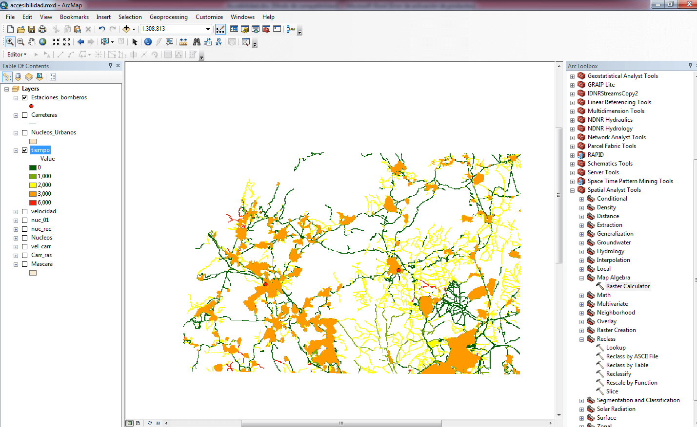 Así hemos obtenido los raster donde el valor de cada celda es el tiempo al que está cada celda del “origen”, es decir de cada estación de bomberos.