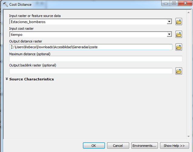 Como capa de origen (‘Input raster or feature source data’) indicamos la capa con la estación de bomberos correspondiente y como raster de coste (‘Input cost raster’) seleccionamos el raster de tiempo.