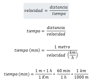 Este tiempo lo vamos a calcular en minutos de manera que tendremos que realizar las siguientes operaciones para pasar los datos de velocidad que actualmente están en km/h a m/min.