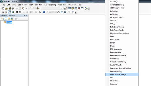 Una vez que tenemos activada la extensión, vamos a fijarla en nuestra barra de herramientas. Esto lo hacemos pulsando sobre la barra superior con el botón derecho y seleccionándola o mediante la opción Customize < Toolbars < Geostatistical Analyst.