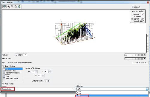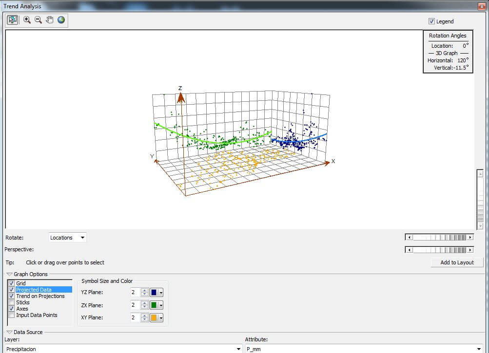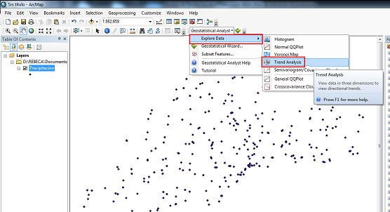 Ahora sí podemos realizar el análisis de tendencias espaciales con ArcGIS para comprobar si existen tendencias direccionales de las precipitaciones así que agregamos nuestra capa de estaciones pluviométricas al proyecto y después seleccionamos la opción para realizar el análisis que queremos hacer Geostatistical Analyst < Explore Data < Trend Analysis.