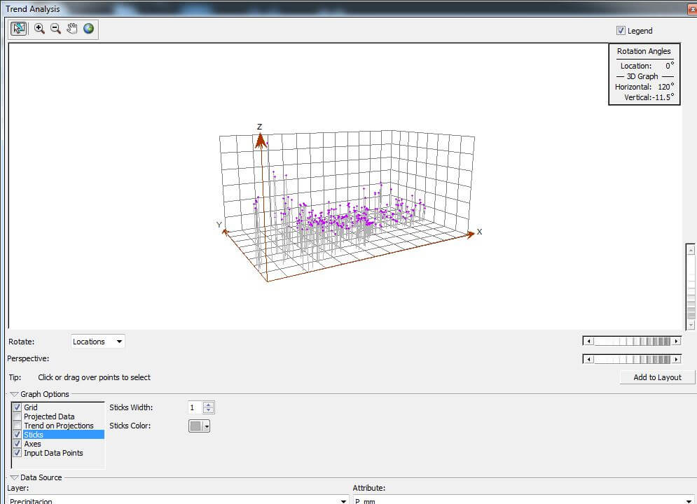 Cada dato de precipitación se ubica en el plano XY y su valor se representa como una altura en la dimensión Z; activando la opción ‘Sticks‘, cada punto se proyecta en su posición desde un valor de Z = 0.