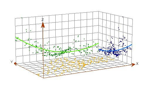 - La línea de tendencia sobre el plano XZ (línea verde) nos muestra la variación de los valores de precipitación de Oeste a Este. En nuestro caso las precipitaciones parecen descender a medida que nos desplazamos hacia el Este aunque presentan un pequeño repunte en el extremo más oriental.