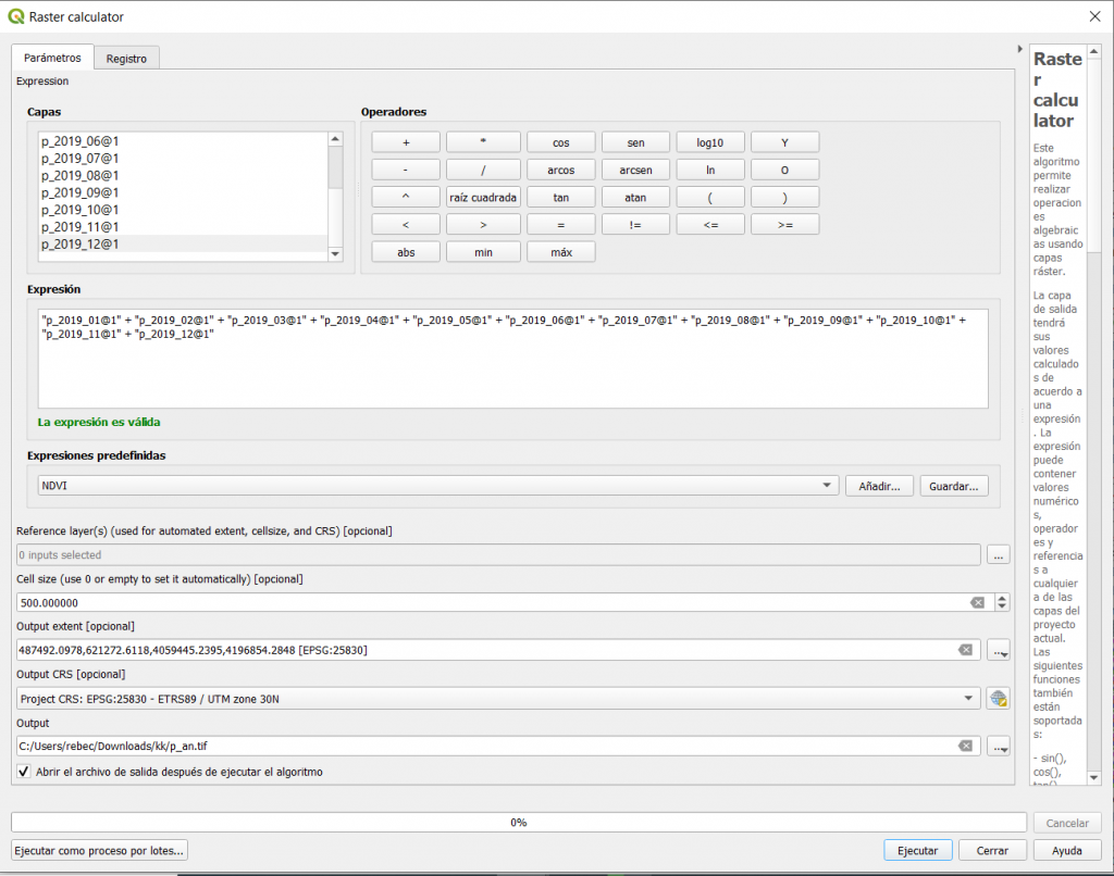 La calculadora raster nos muestra todas y cada una de las capas disponibles en el proyecto actual con las que podemos realizar las operaciones. Lo que debemos hacer es sumar los 12 raster de precipitación mensual, así que seleccionamos uno de ellos haciendo doble clic sobre él, pulsamos sobre el símbolo «+», seleccionamos la segunda capa a sumar y así sucesivamente hasta  completar la suma de los 12 raster:
