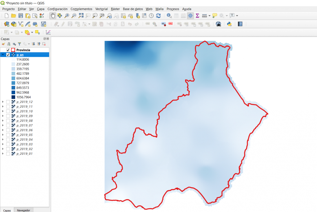 Nosotros estamos realizando un estudio para conocer cual es la precipitación media anual en nuestra zona de estudio. Para hacerlo disponemos de diferentes archivos en formato raster que contienen la precipitación media mensual (uno por cada mes) así que los cargamos en nuestro proyecto.