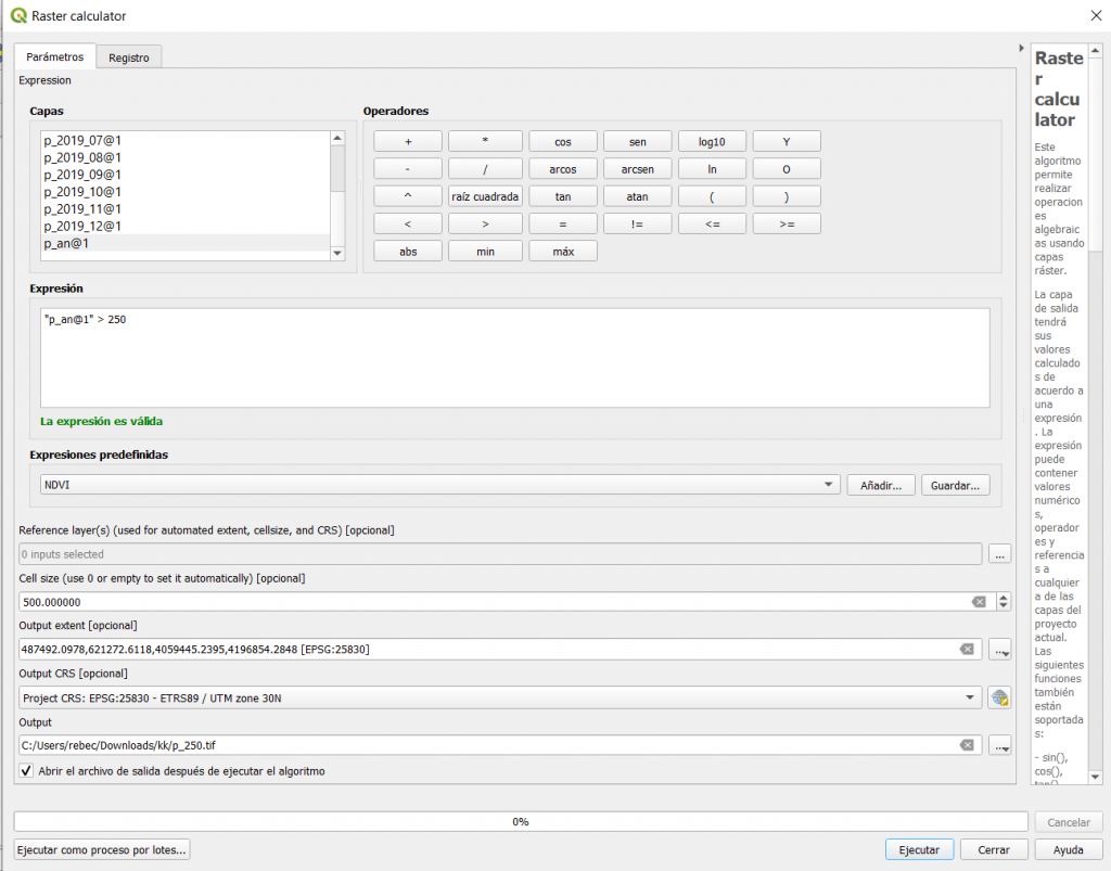 La calculadora raster permite realizar multitud de operaciones matemáticas entre archivos raster. Podemos realizar operaciones condicionales, operaciones matemáticas, operaciones trigonométricas, operaciones lógicas…