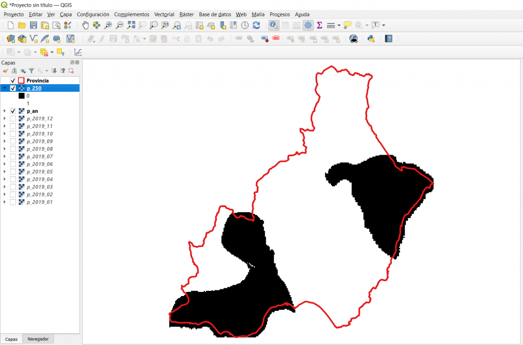 Según la imagen, en color negro (valor 0) se muestran todas las celdas con una precipitación media anual menor o igual a 250 mm y en color blanco (valor 1) aquellas donde sí se superan los 250 mm anuales.