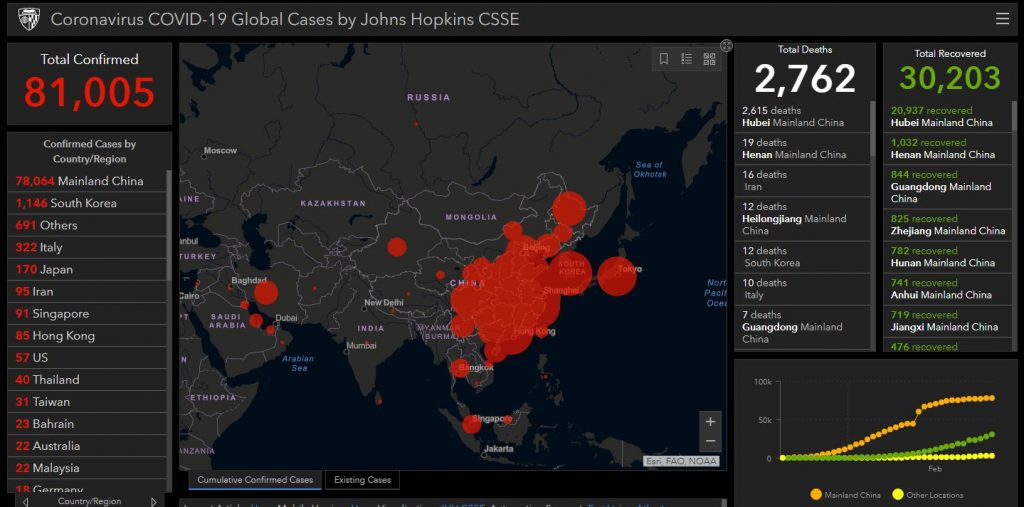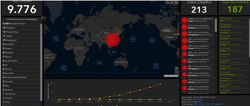 El Centro Johns Hopkins de Ciencia e Ingeniería de Sistemas ha creado un mapa interactivo, desarrollado con la plataforma ArcGIS de Esri, en el que se recopilan datos en tiempo real sobre contagios y casos de coronavirus (2019-nCoV) en todo el mundo.