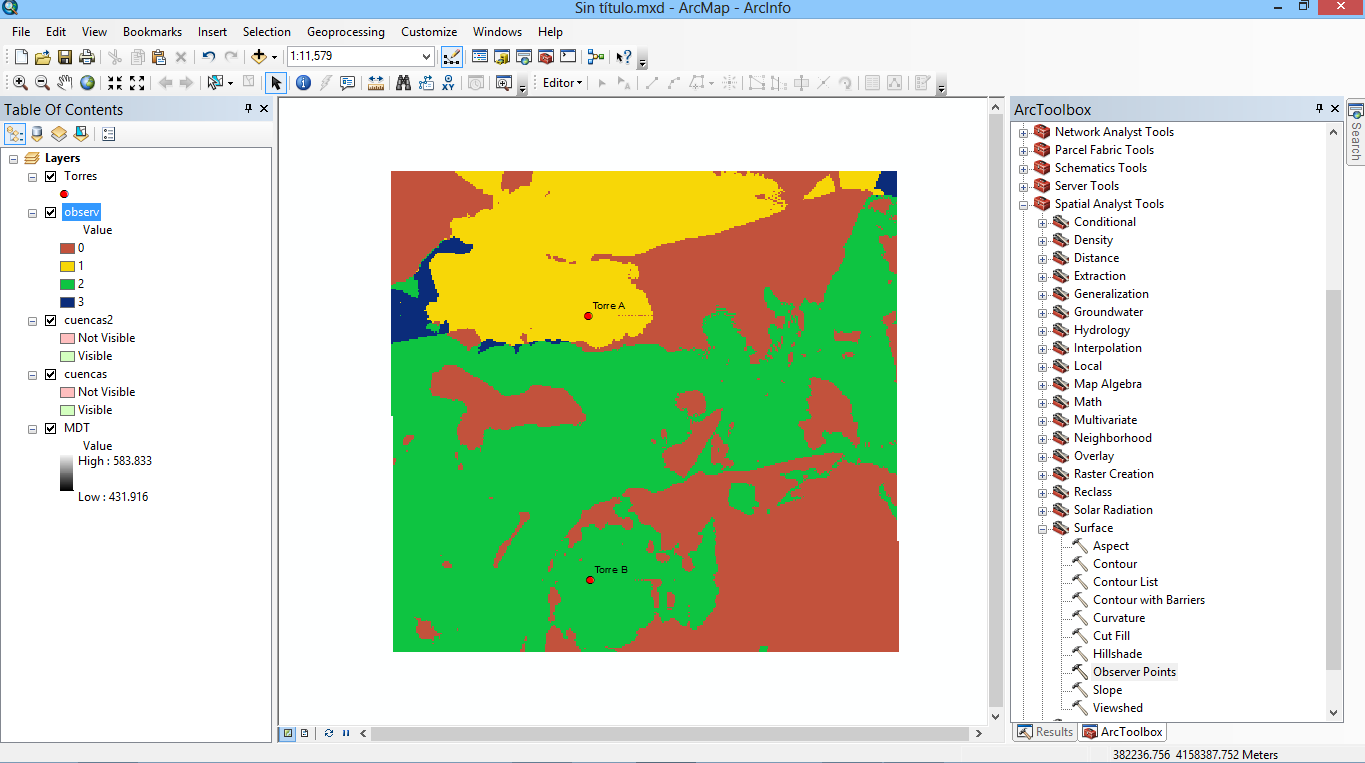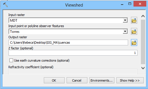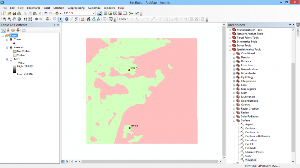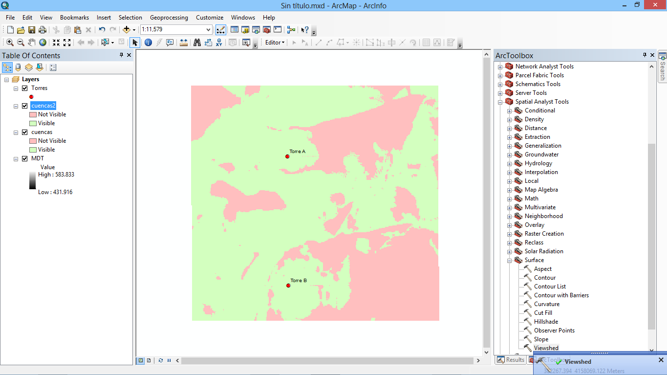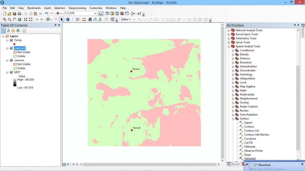 Para hacer éste análisis cargamos la capa que contiene la ubicación de las torres y seleccionamos la herramienta de cuenca visual ArcToolbox < Spatial Analyst < Surface < Viewshed.