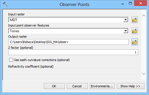 Para conocer este dato utilizamos la herramienta de Puntos de observador ArcToolbox < Spatial Analyst < Surface < Observer Points. El menú que debemos rellenar es exactamente igual que el anterior. Indicamos cuál es el MDT a utilizar, la capa que contiene la ubicación de las torres y asignamos un nuevo nombre a la capa de salida.