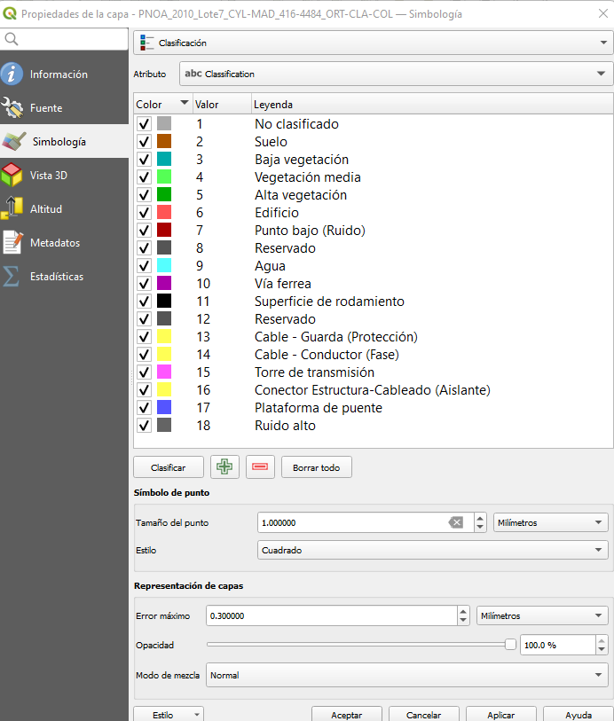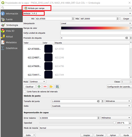 La otra forma de ver la información de los datos LIDAR en QGIS es mostrando las altitudes de los puntos. Esto lo hacemos nuevamente mediante la simbología, pero en este caso seleccionaremos un Atributo por Rampa, y el atributo a mostrar será «Z«: