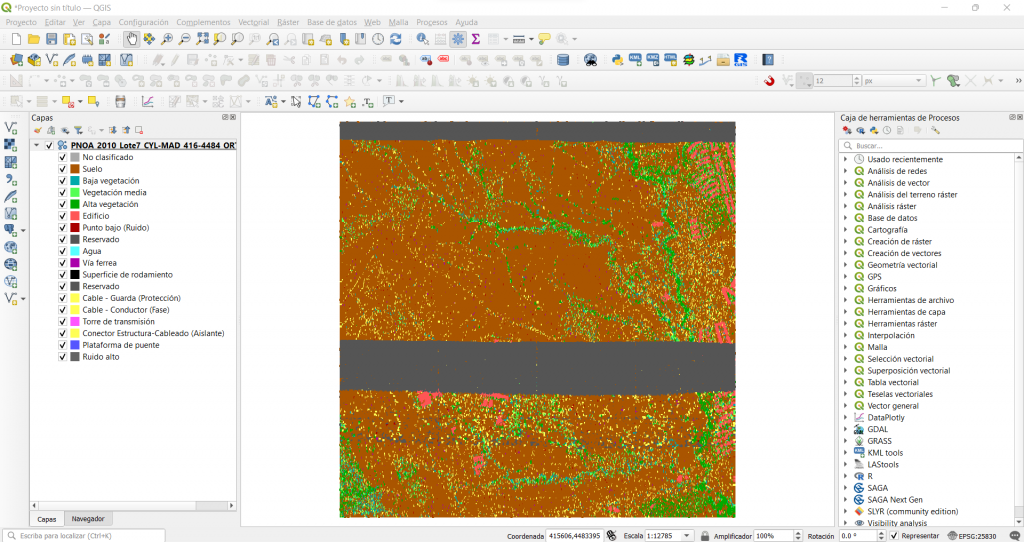 Los datos LIDAR se componen de una serie de puntos que se pueden visualizar y analizar en QGIS para obtener un montón de información del terreno como las zonas de suelo desnudo, cubiertas forestales, láminas de agua, etc.