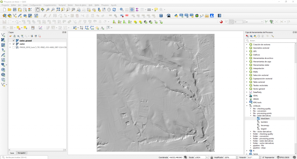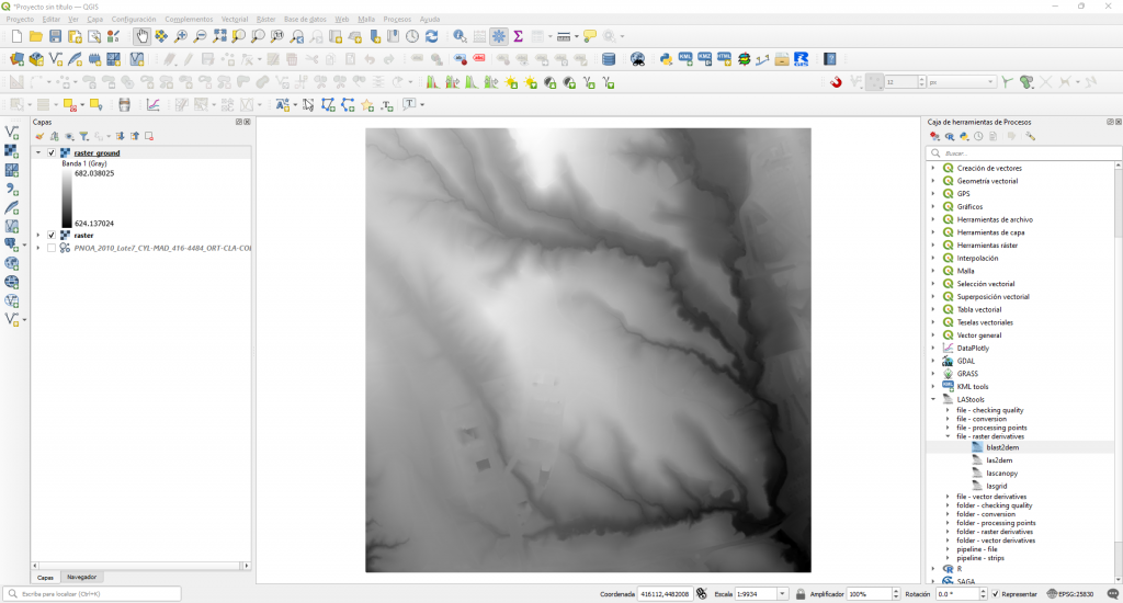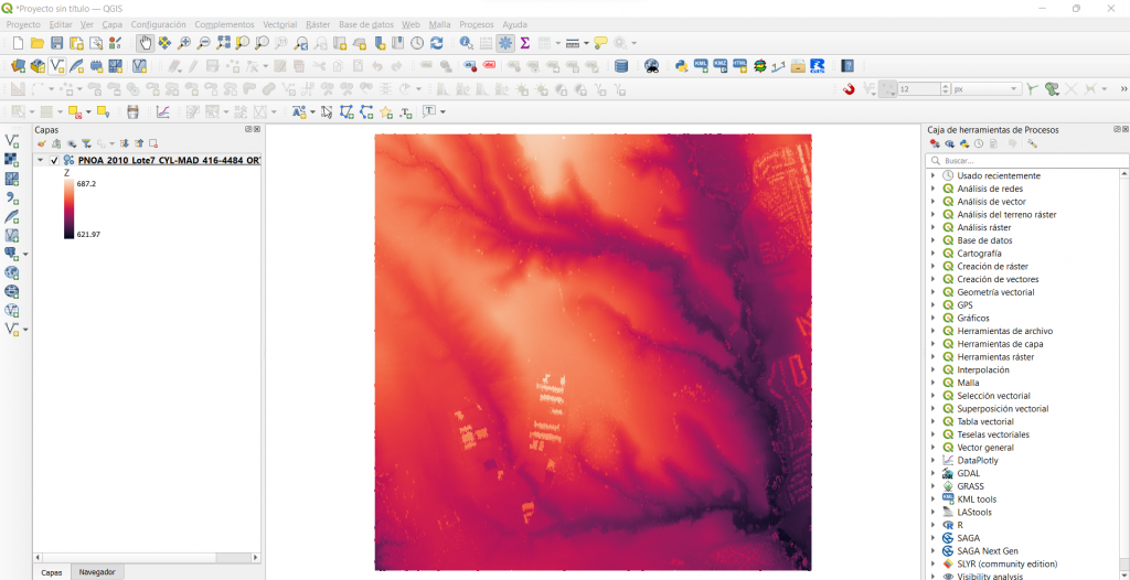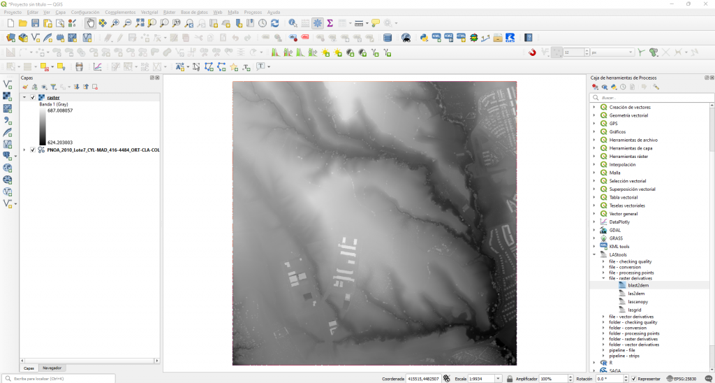 Lo que obtenemos ahora no es una nube de puntos con datos de altitud, si no un Modelo Digital de Elevaciones, es decir, un raster que contiene valores de elevación en todas sus celdas, y con el que podríamos realizar análisis y operaciones (por ejemplo mediante la calculadora raster):