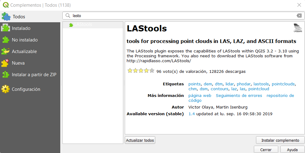 Para poder procesar los datos LIDAR en QGIS, debemos descargarnos el complemento LAStools desde el siguiente enlace https://rapidlasso.com/lastools/
