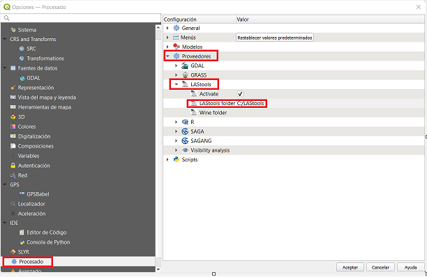 Ahora configuramos la herramienta para indicarle cual es la carpeta que contiene LAStools (será la carpeta donde hemos descomprimido el .zip que nos descargamos previamente): Configuración < Opciones < Procesado < Proveedores < LAStools < LAStools folder. Además debemos asegurarnos de que está activado: