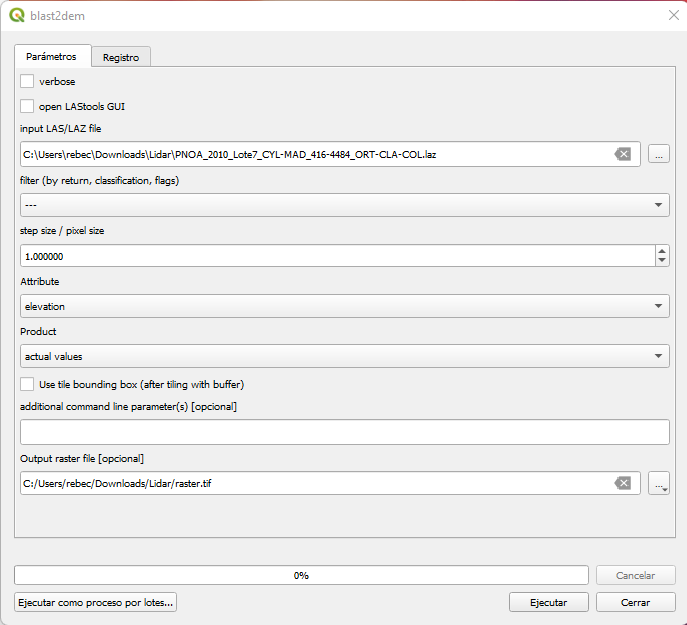 Para obtener un Modelo Digital de Elevaciones buscaremos la herramienta blast2dem que se encuentra dentro de LAStools < file – raster derivates < blast2dem, y lo configuramos de la siguiente forma:
