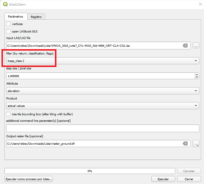 Para hacerlo, volvemos a usar la herramienta blast2dem, pero en este caso, en el campo «filter by» seleccionaremos «keep_class 2«. La clase 2 representa el Ground (el suelo) en LIDAR de manera que de esta forma le estamos indicando que coja todos los puntos LIDAR y los filtre por los que son «Suelo». Así vamos a obtener un raster que contiene la altitud a nivel de suelo, o lo que es lo mismo un Modelo Digital del Terreno (MDT):