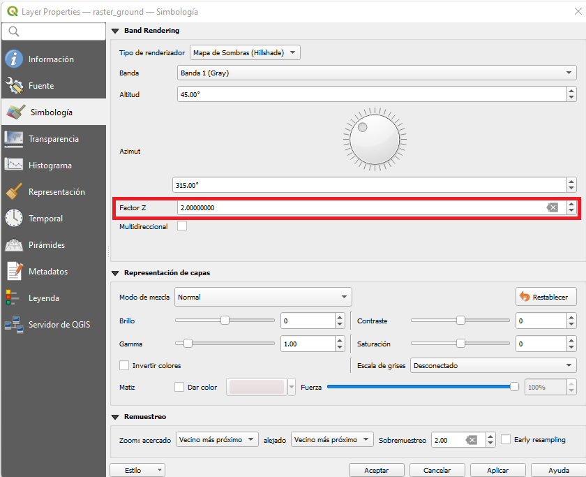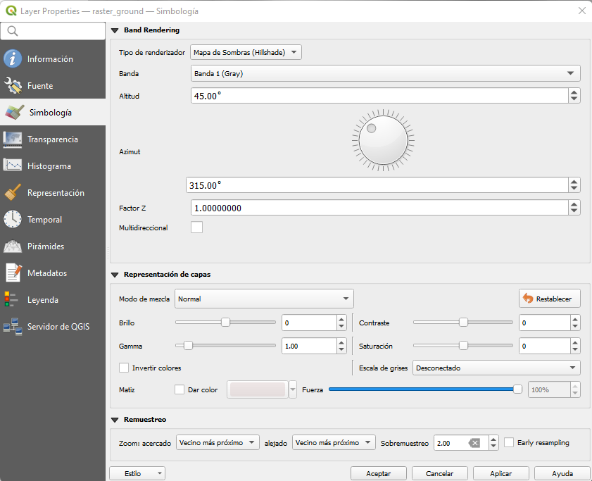 Por último vamos a ver una opción muy interesante que nos permite visualizar el relieve del terreno de forma mucho más nítida. Se trata del mapa de iluminación – sombras. Para generarlo accedemos a la simbología de nuestro MDT y en Tipo de renderizador seleccionamos Mapa de sombras (Hillshade) y aceptamos.