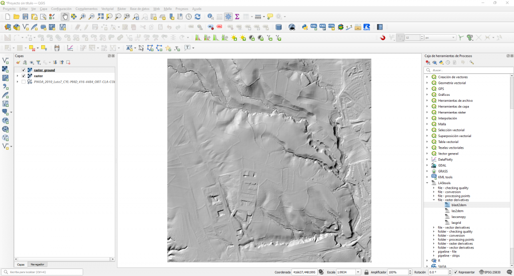 Mediante el procesado de datos LIDAR en QGIS podemos obtener un Modelo Digital de Elevaciones (MDE), es decir, un archivo raster donde las celdas contienen la elevación del terreno.