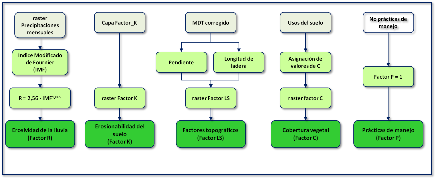 Nosotros vamos a obtener y analizar el riesgo de erosión de una cuenca hidrológica y el proceso que vamos a seguir para obtener cada uno de los factores que intervienen en la USLE es el siguiente: