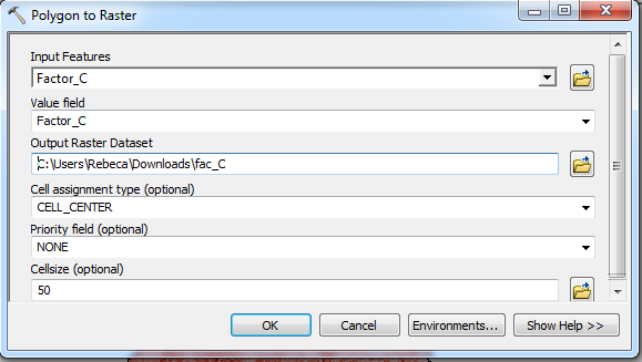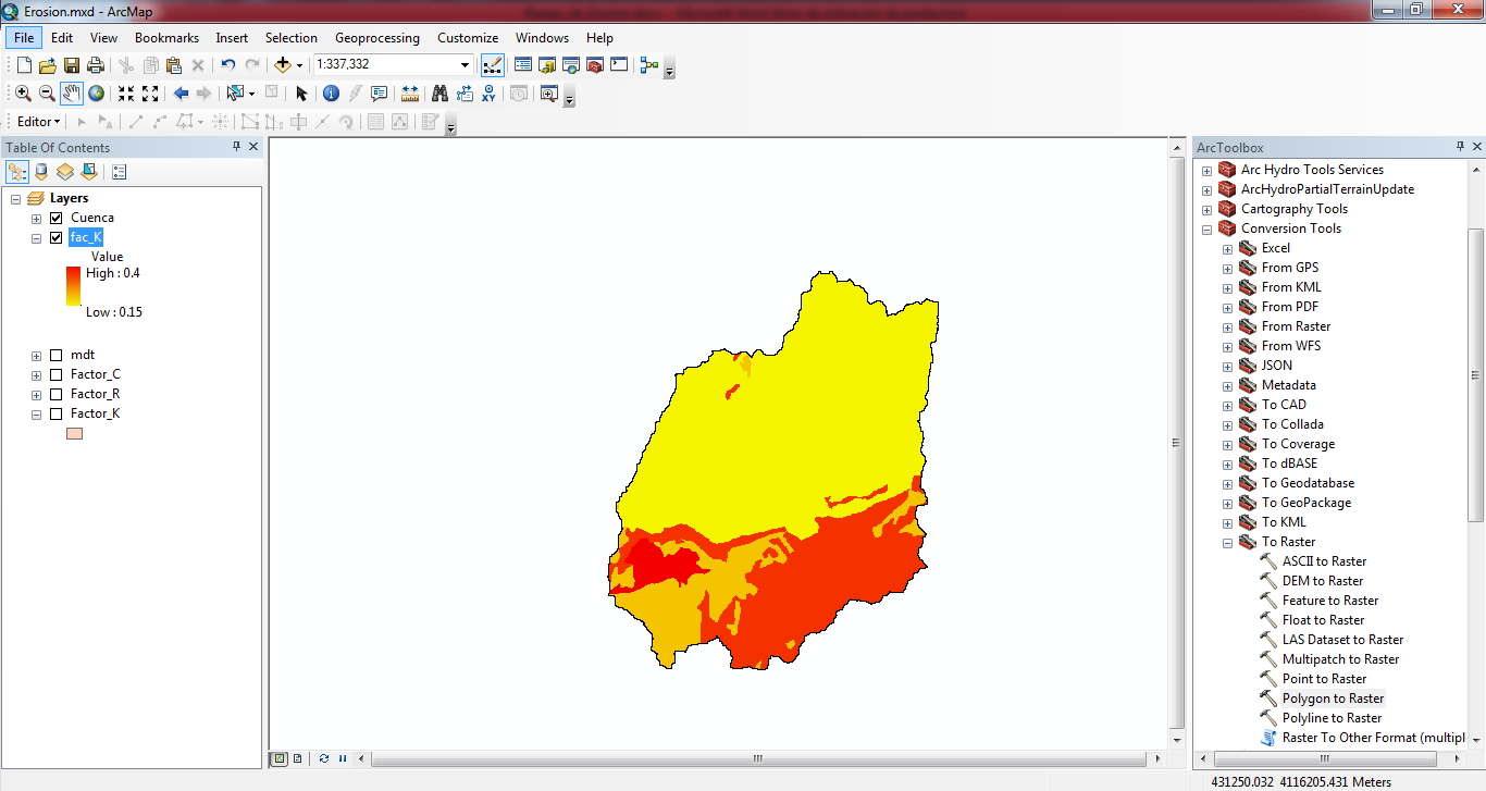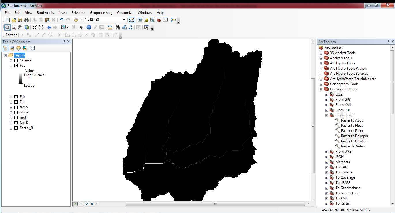 Para ello, utilizamos la herramienta de conversión para trasformar esta capa de polígonos (formato vectorial ) a formato raster ArcToolbox < Conversion Tools < To Raster < Polygon to Raster.