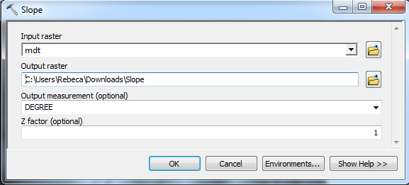 Seleccionamos el MDT y asignamos un nombre a la capa de salida. La herramienta nos permitirá calcular la pendiente en grados (‘Degree’) o en % (‘Percent Rise’); seleccionamos grados.