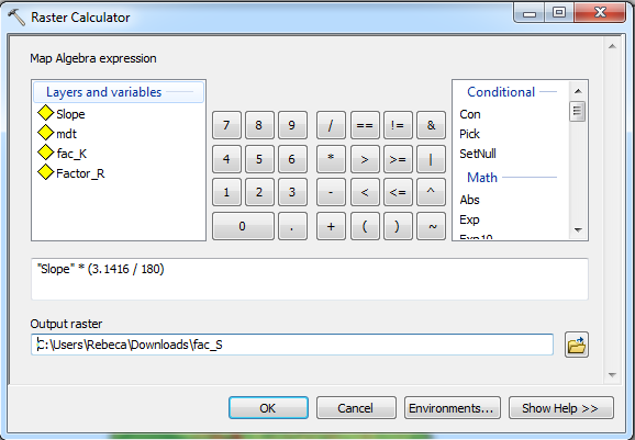 Este raster recoge la pendiente (en grados) pero la fórmula que vamos a emplear en el cálculo del factor LS requiere que la pendiente esté calculada en radianes así que tenemos que multiplicar la pendiente obtenida por π/180. Abrimos la calculadora raster para escribir la expresión correspondiente ArcToolbox < Spatial Analyst Tools < Map Algebra < Raster calculator.