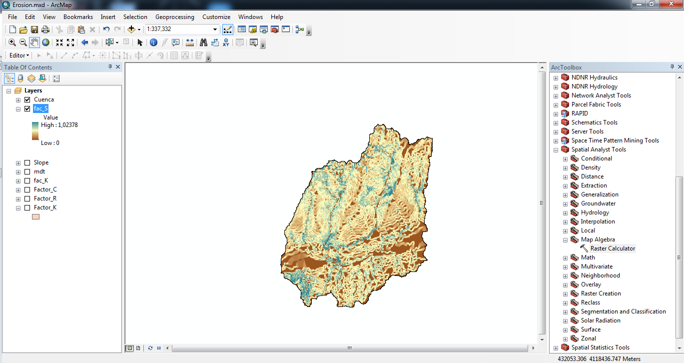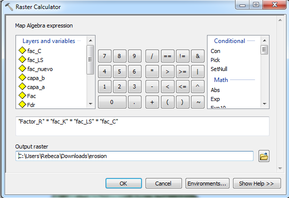 Utilizamos una vez más la calculadora raster ArcToolbox < Spatial Analyst Tools < Map Algebra < Raster Calculator, para escribir la fórmula teniendo en cuenta que el factor P es igual a la unidad por lo que no será necesario incluirlo en el cálculo.