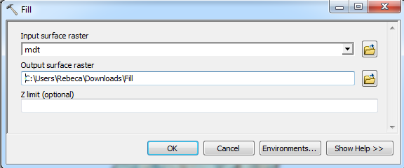 Un sumidero es una celda o un conjunto de celdas conectadas espacialmente a la que no se le puede asignar una dirección de flujo, por lo tanto para garantizar la representación correcta de cuencas y arroyos hay que realizar el relleno de sumideros. Abrimos la herramienta correspondiente ArcToolbox < Spatial Analyst Tools < Hydrology < Fill y lo único que debemos hacer es seleccionar el raster a rellenar (‘Input surface raster’), es decir, nuestro MDT, y asignar un nombre al nuevo raster que se va a crear (‘Output surface raster’). Al hacerlo obtenemos un nuevo raster aparentemente idéntico al MDT que habíamos generado pero aunque no lo apreciaremos, este nuevo raster será el MDT corregido, donde se habrán rellenado los sumideros en caso de que existieran.