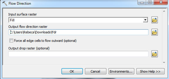 Obtenemos el mapa de direcciones de flujo de nuestra cuenca ArcToolbox < Spatial Analyst Tools < Hydrology < Flow Direction. Indicamos el MDT sobre el que se quiere obtener el mapa de direcciones de flujo (‘Input surface raster’); en este caso debemos especificar que es el denominado «Fill» ya que este raster es el que tiene los sumideros corregidos y como siempre asignamos un nombre a la capa de salida (‘Output flow direction raster’).