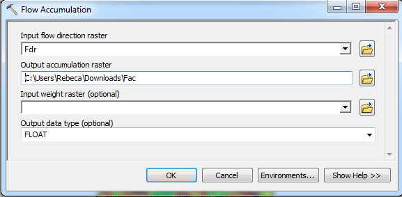 Indicamos el mapa de direcciones que vamos a utilizar para su cálculo (‘Input flow direction raster’) y asignamos un nombre a la capa de salida (‘Output accumulation raster’). Dejamos por defecto «Float» como tipo de dato de salida (‘Output data type’). Obtenemos el mapa donde observamos en negro las zonas con una acumulación de flujo 0 (es decir, zonas donde no existe acumulación de flujo) y en blanco aquellas zonas donde sí se produce la acumulación.