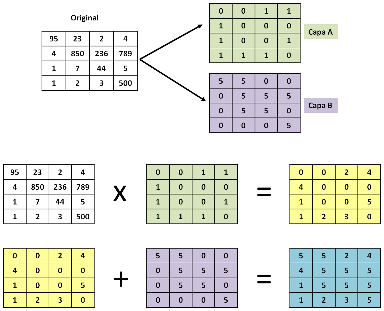 Ahora que tenemos la capa original, la capa A y la capa B, volvemos a la calculadora raster y realizamos la operación que explicamos anteriormente: