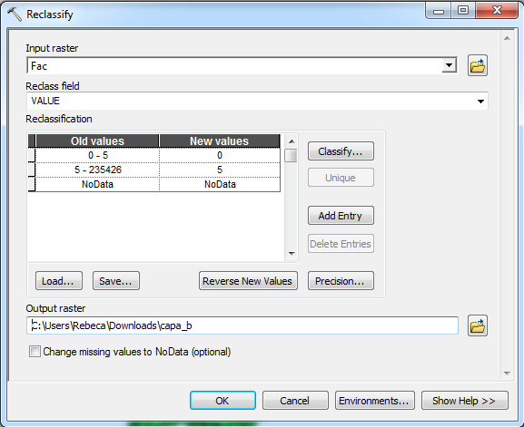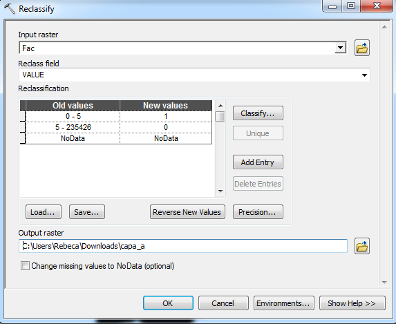 Para obtener las que hemos denominado «Capa A» y «Capa B» tendremos que «modificar» los valores del raster de Fac original para lo que vamos a realizar una reclasificación ArcToolbox < Spatial Analyst Tools < Reclass < Reclassify.