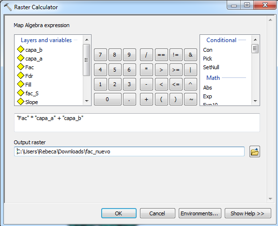 Después lo que haremos será multiplicar la Fac original por la Capa A con lo que conseguiremos obtener un raster que conservará los valores originales a excepción de aquellas celdas donde el valor original era mayor de 5, que ahora será 0. Una vez hecho esto, a esta nueva capa le sumaremos la Capa B de manera que esas celdas que tienen un valor de 0 tomarán el valor de 5 que es el máximo que queremos fijar.