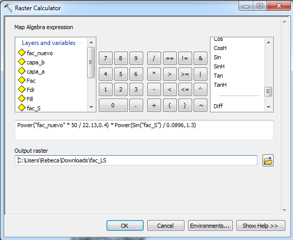 Ahora únicamente tendremos que utilizar la calculadora raster de nuevo para calcular el factor LS mediante la fórmula correspondiente: