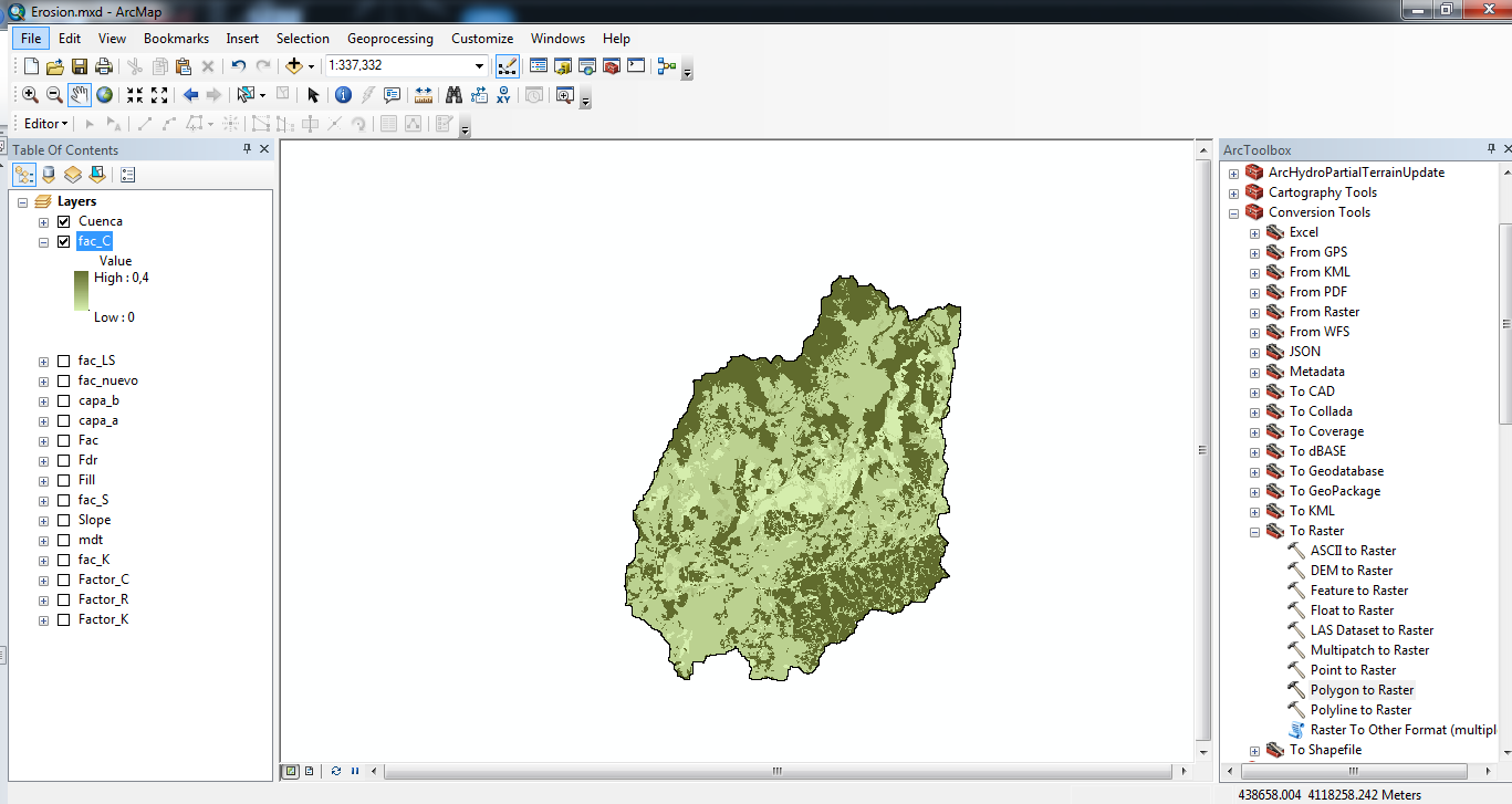Para nuestro estudio nos han facilitado una capa vectorial que contiene varios polígonos y para cada uno de ellos tenemos información del uso de suelo que presenta y el dato del factor C. Por lo tanto lo único que debemos hacer es obtener el raster correspondiente ArcToolbox < Conversion Tools < To Raster < Polygon to Raster.