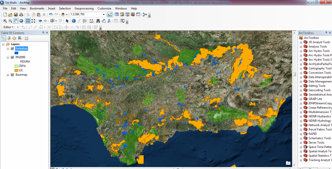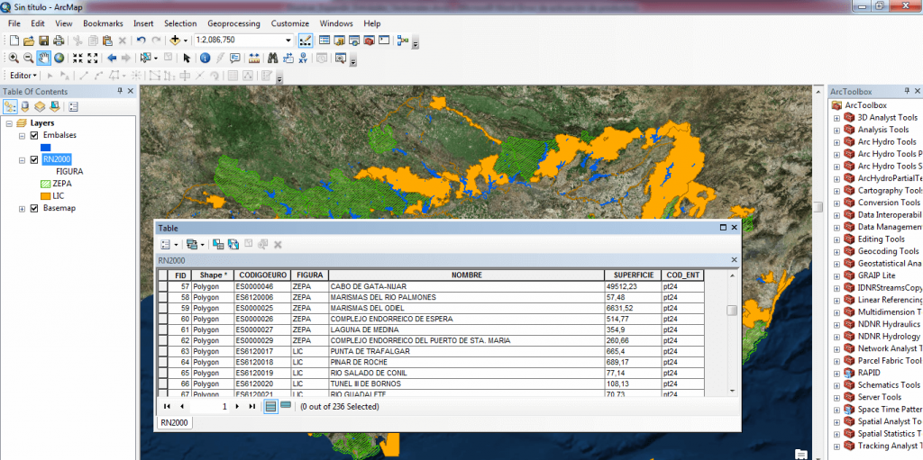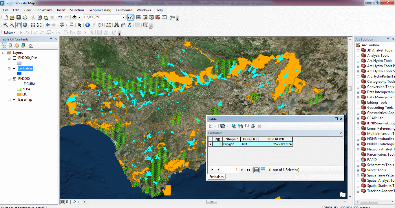 Nosotros tenemos una capa con los embalses de Andalucía pero si abrimos la tabla de atributos veremos que todos los embalses están recogidos en un único registro, con la superficie en hectáreas.